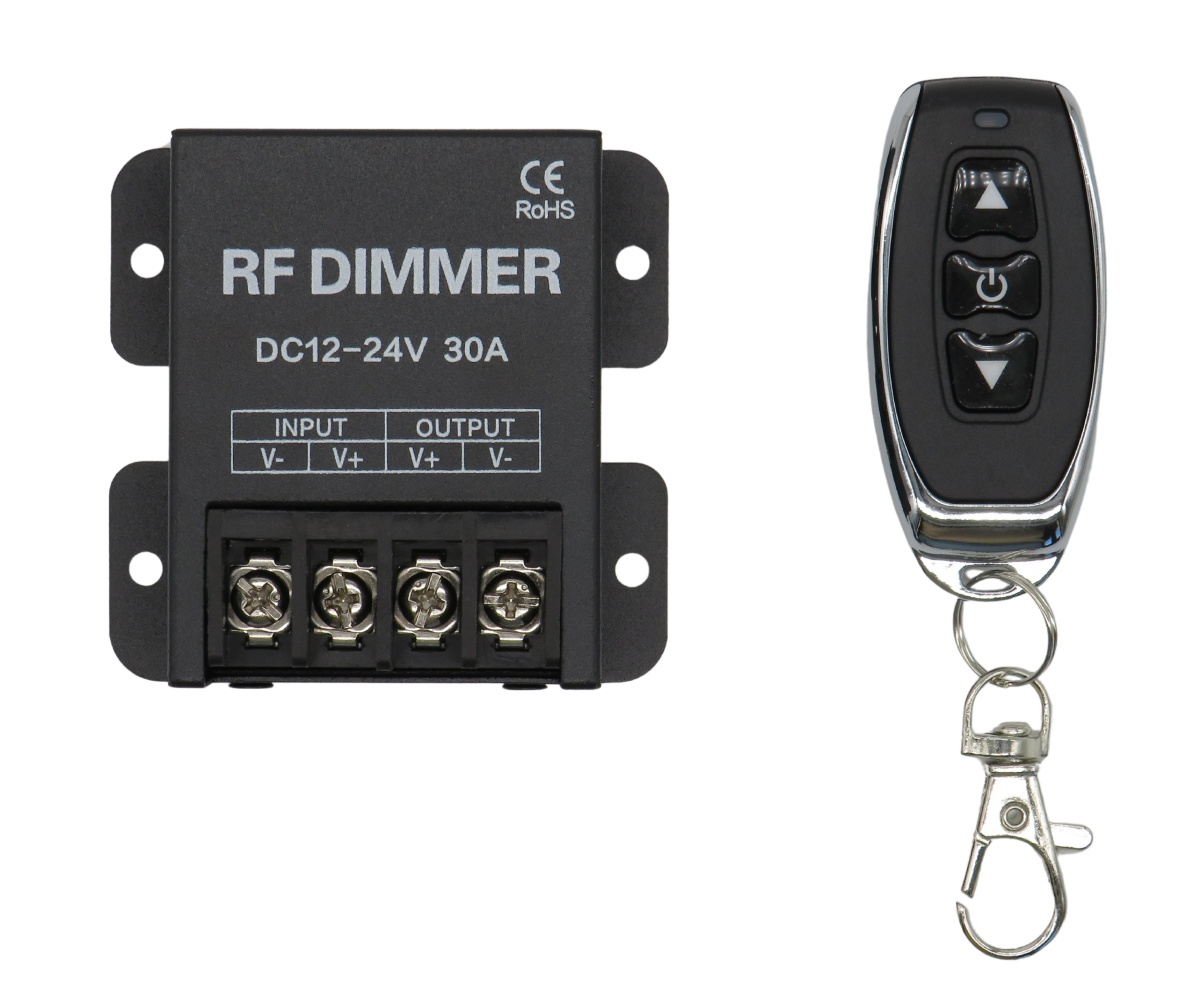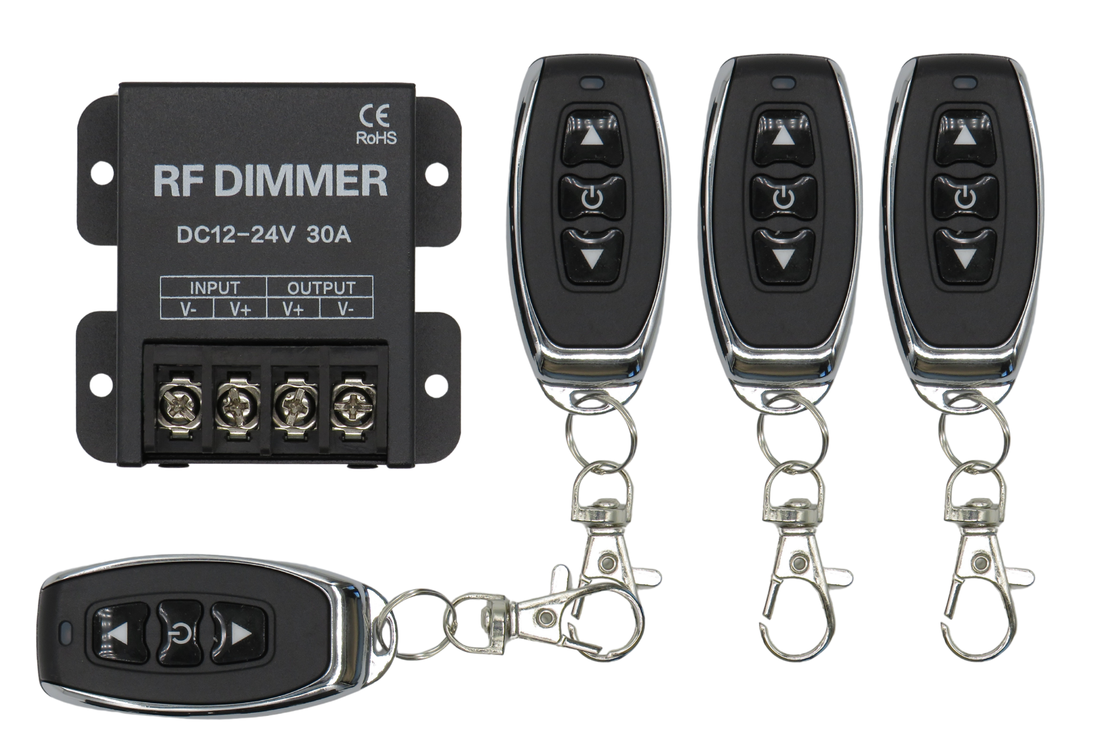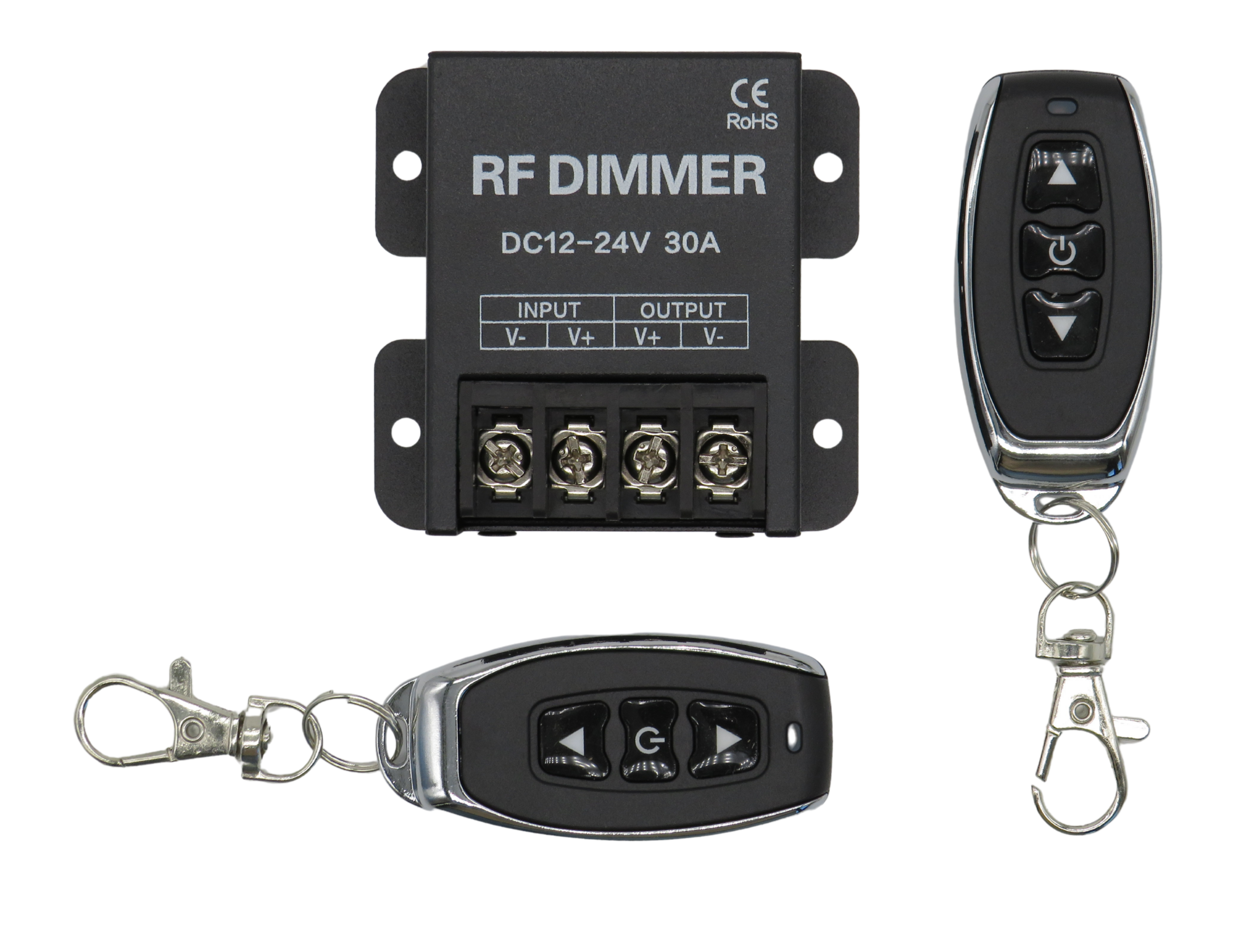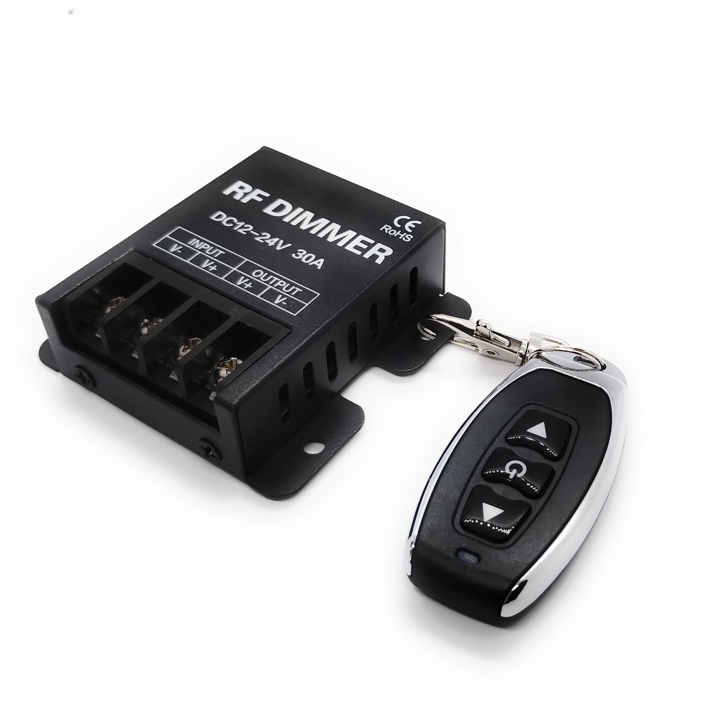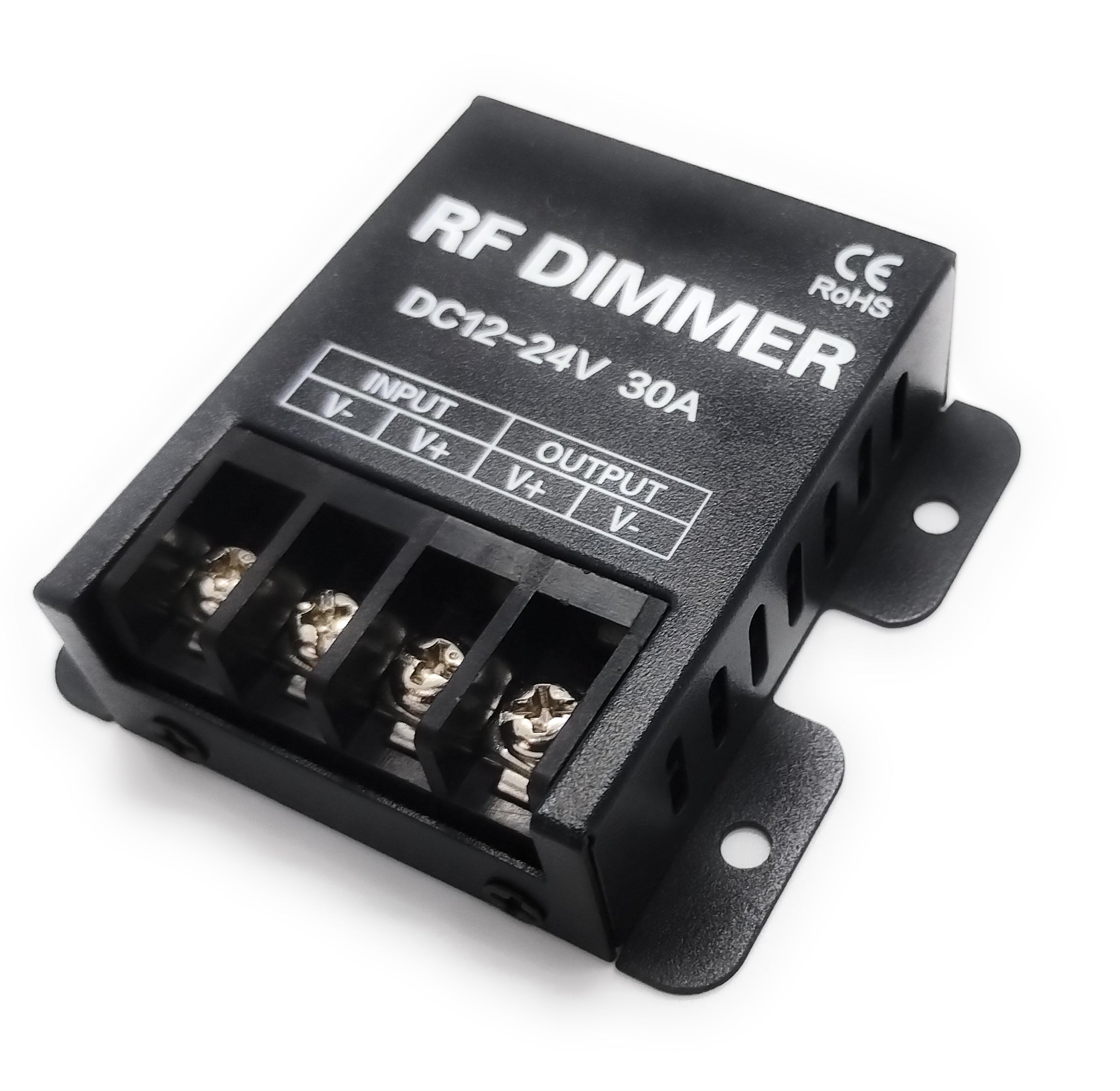 Ce variateur RF moderne est la solution idéale pour tous ceux qui souhaitent contrôler facilement et en toute flexibilité leurs lampes ou moteurs LED de 12 à 24 V. Équipé d'une télécommande sans fil fonctionnelle, il permet une variation continue de l'intensité lumineuse, adaptée à vos besoins. Grâce à son raccordement derrière le transformateur LED 12 V/24 V CC, il est compatible avec la quasi-totalité des ampoules LED courantes d'une intensité maximale de 30 A.